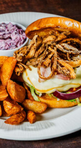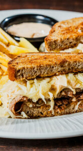 Egy klasszikus amerikai kedvenc a Ribster stílusában: szaftos marhaszegy, olvasztott sajt, savanyú káposzta és krémes orosz szósz, friss kenyérben. Az élményt fűszeres hasábburgonya teszi teljessé.